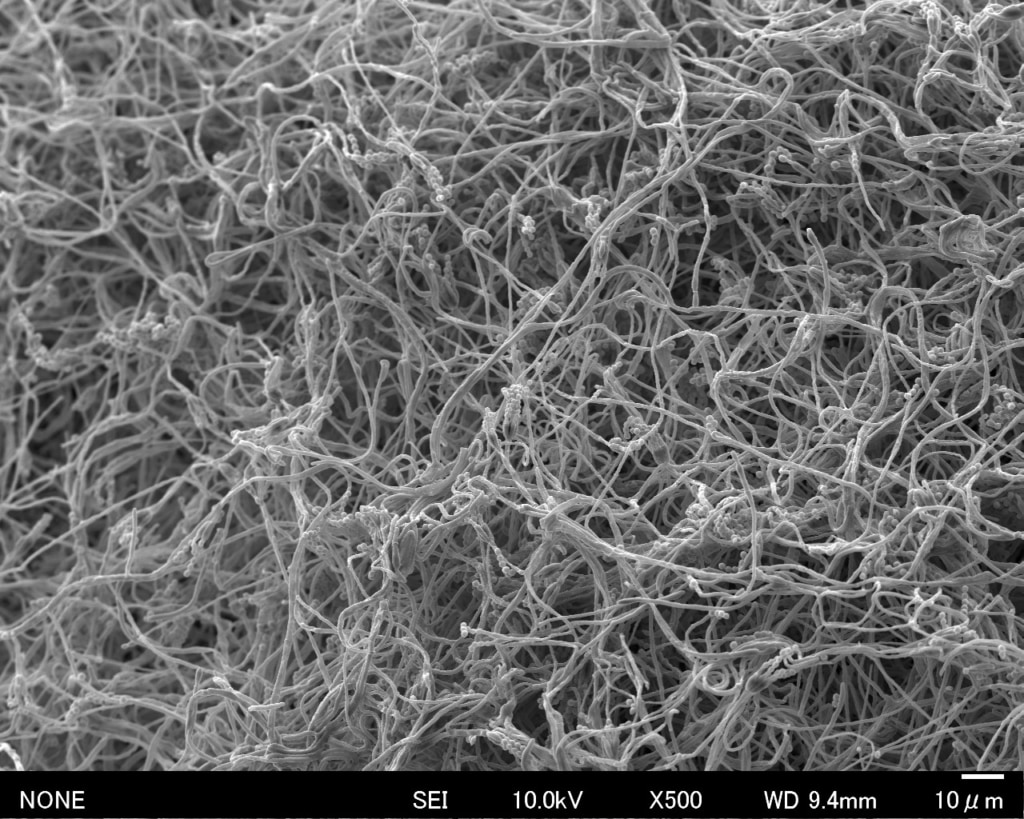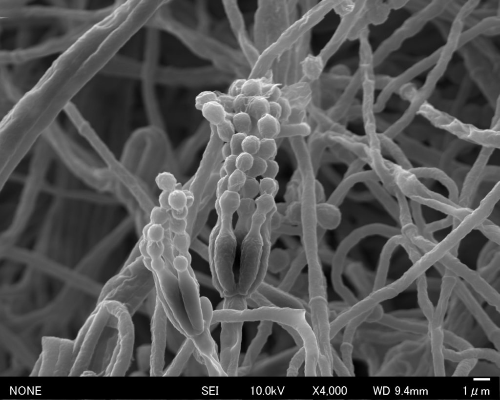 日常お目にかかるカビが代表的です。例えば、パンに生えた青いカビ、みかんに生えたカビ、風呂場のタイルに生えた黒いカビなどです。これらを顕微鏡でみると、糸状のものがたくさん絡み合っているのが分かります。