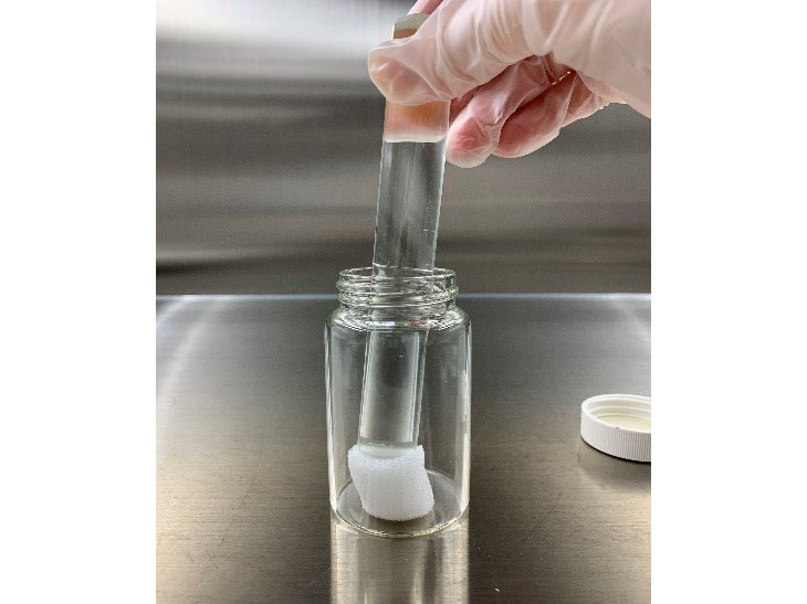 2)試験片(直径24mmの円柱状のスポンジ)をねじ口瓶に入れ、試験菌液を接種し、試験片棒で10回以上揉み、1時間放置します。