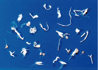 ![]() 1)きょう雑物 ダウン、フェザー及びファイバー以外のくず並びに異物。羽毛充填物としては不適切なもので、品質に問題のある羽毛製品には多く含まれていることがあります。 |