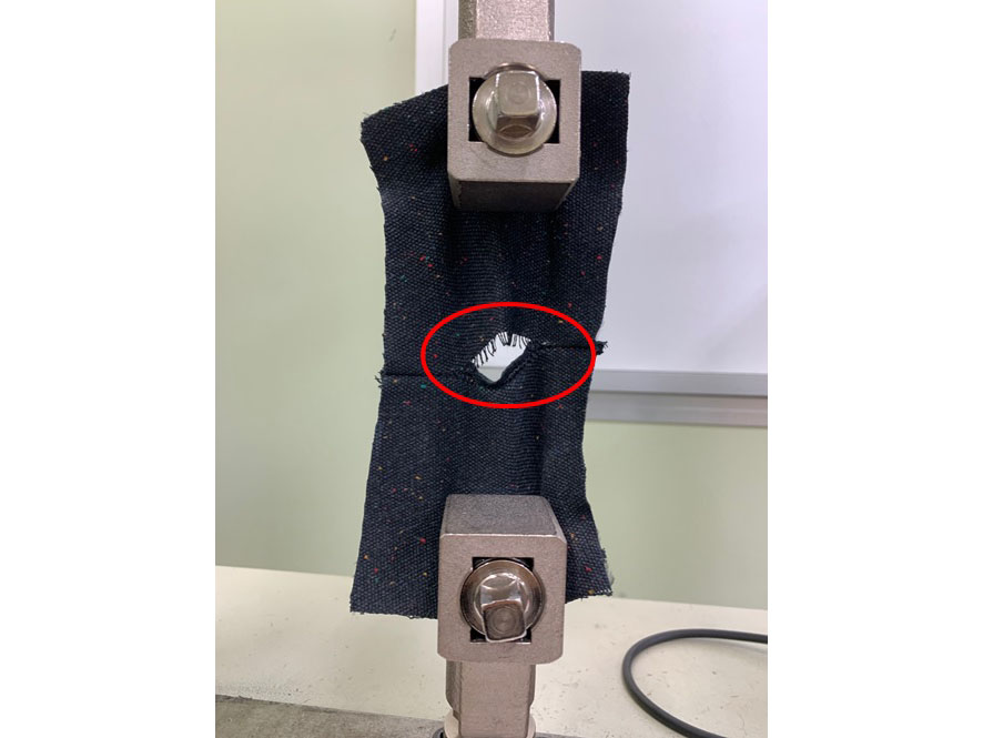 - 固定した試料を300mm/minの速度で引張し、試料が破損するときの強度を測定します。また、試料の破損状況も記録します。
